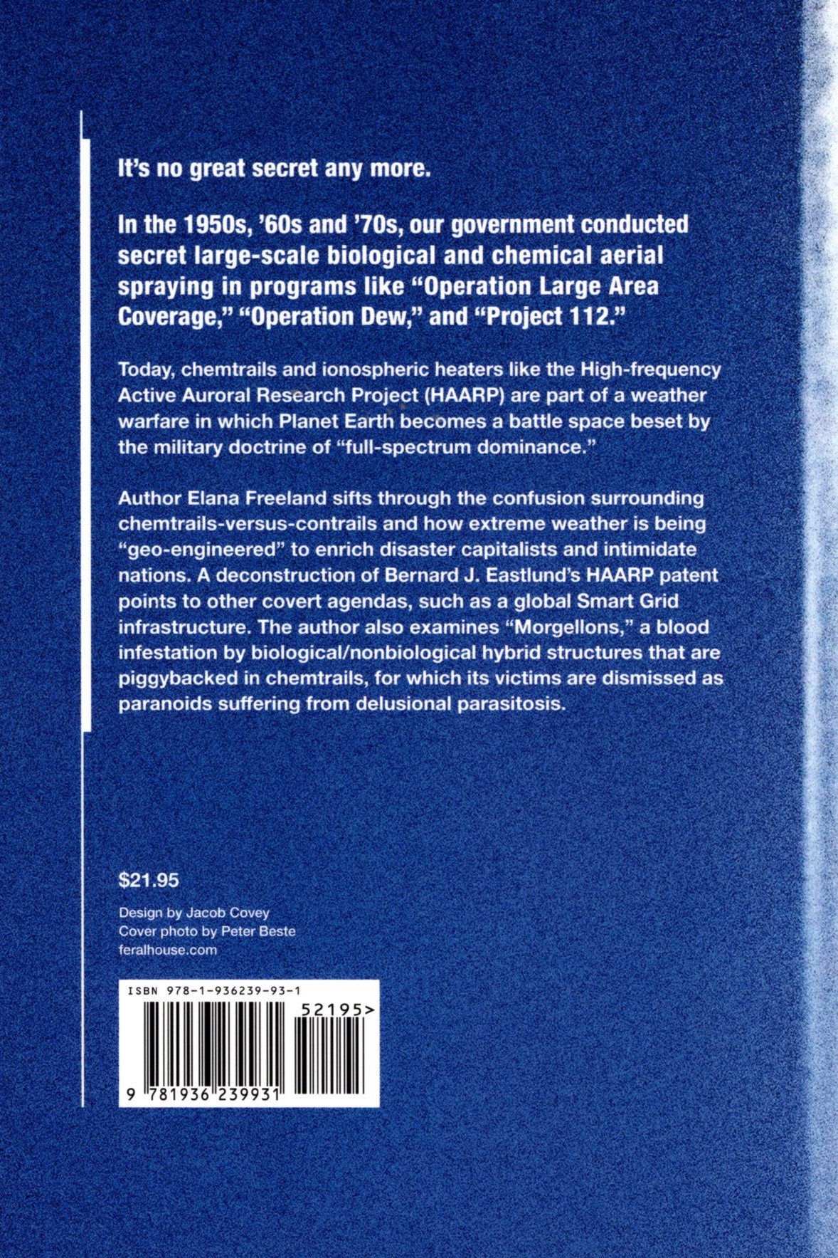 Elana M. Freeland’s startling book sifts through the confusion surrounding chemtrails-versus-contrails and how extreme weather is being “geo-engineered” to enrich disaster capitalists and intimidate nations. A deconstruction of Bernard J. Eastlund’s HAARP patent points to other covert agendas, such as a global Smart Grid infrastructure that enables access to every body and brain on Earth, a future that erases lines between human and machine, and Nanobiological hybrids that infest and harm human bodies.