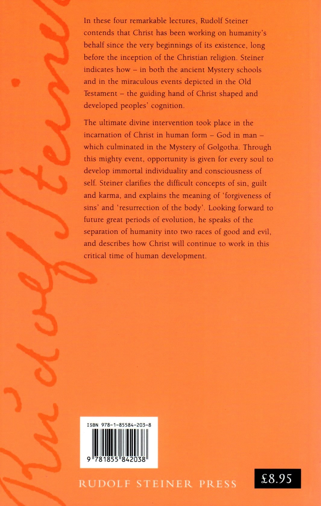 The ultimate divine intervention took place with the incarnation of Christ in human form, which culminated in the Mystery of Golgotha. Through this grand event, the opportunity arose for every soul to develop immortal individuality and “I” awareness. Steiner clarifies the difficult concepts of sin, guilt, and karma and explains the meaning of “forgiveness of sins” and the “resurrection of the body.” Looking forward to future great periods of evolution, he speaks of the separation of humanity into the two races of good and evil and describes how Christ will continue to work in that critical time of human development.