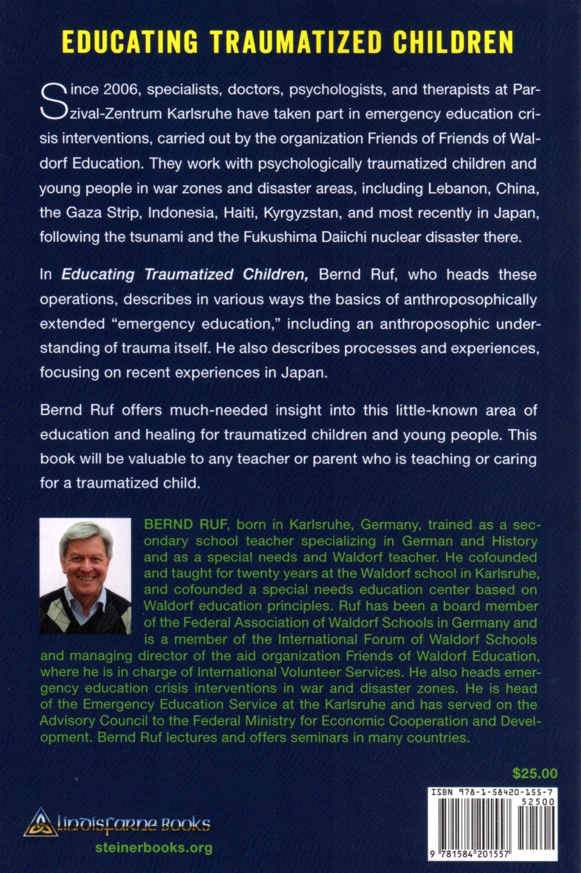 Bernd Ruf was born in Karlsruhe, Germany, in 1954. He trained as a secondary school teacher at Mannheim University, specializing in German and History before gaining additional qualifications as a special needs teacher (Reutlingen) and as a Waldorf teacher (Stuttgart). Bernd Ruf co-founded the Waldorf School in Karlsruhe, where he also taught for 20 years, and the Parzival Kompetenzzentrum für Bildung, Förderung und Beratung, a special needs education centre that is based on the principles of Waldorf Education. Ruf has been director at Parzival since 2003. From 1993 to 2007 he was a board member of the Bund der Freien Waldorfschulen (Federal Association of Waldorf Schools) in Germany. Since 1993 he has been a member of the International Forum of Waldorf Schools and, since 1987, he has been Managing Director of the aid organization Friends of Waldorf Education where he is in charge of International Volunteer Services. He has been heading emergency education crisis interventions in war and disaster zones since 2006. These interventions have led him to Lebanon, China, the Gaza Strip, Indonesia, Haiti, Kyrgyzstan, Japan, and Kenya. He is head of the Emergency Education Service at the Karlsruhe Parzival Centre and has been on the Advisory Council to the Federal Ministry for Economic Cooperation and Development since 2007. Bernd Ruf lectures and offers seminars in many countries.