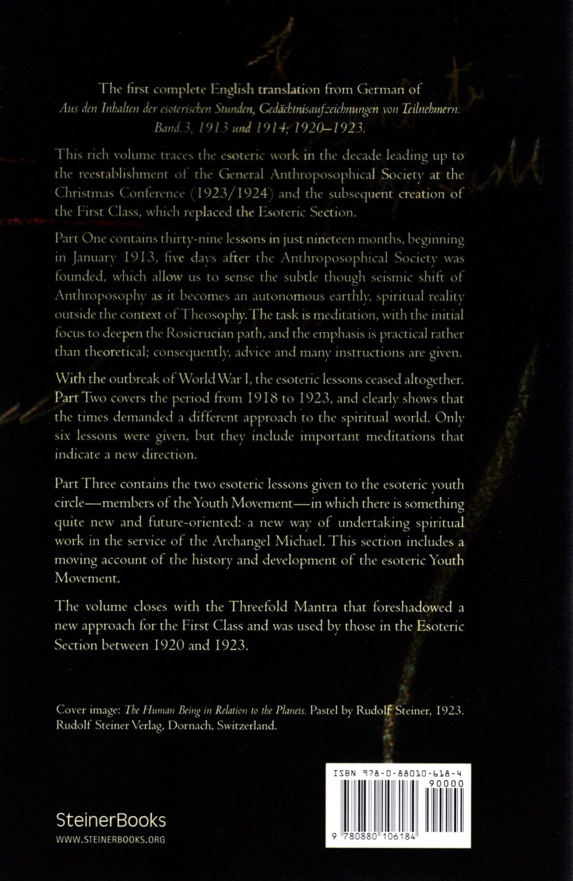 This volume is the English translation of «Aus den Inhalten der esoterischen Stunden, Gedächtnisaufzeichnungen von Teilnehmern. Band.3, 1913 und 1914; 1920-1923» (GA 266/3).