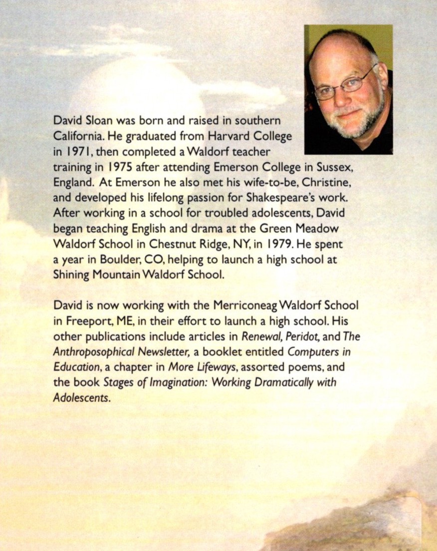 David Sloan was born and raised in southern California. He graduated from Harvard College in 1971, then completed a Waldorf teacher training in 1975 after attending Emerson College in Sussex, England. At Emerson he also met his wife-to-be, Christine, and developed his life long passion for Shakespeare’s work. After working in a school for troubled adolescents, David began teaching English and drama at the Green Meadow Waldorf School in Chestnut Ridge, NY, in 1979. He spent a year in Boulder, CO, helping to launch a high school at Shining Mountain Waldorf School.