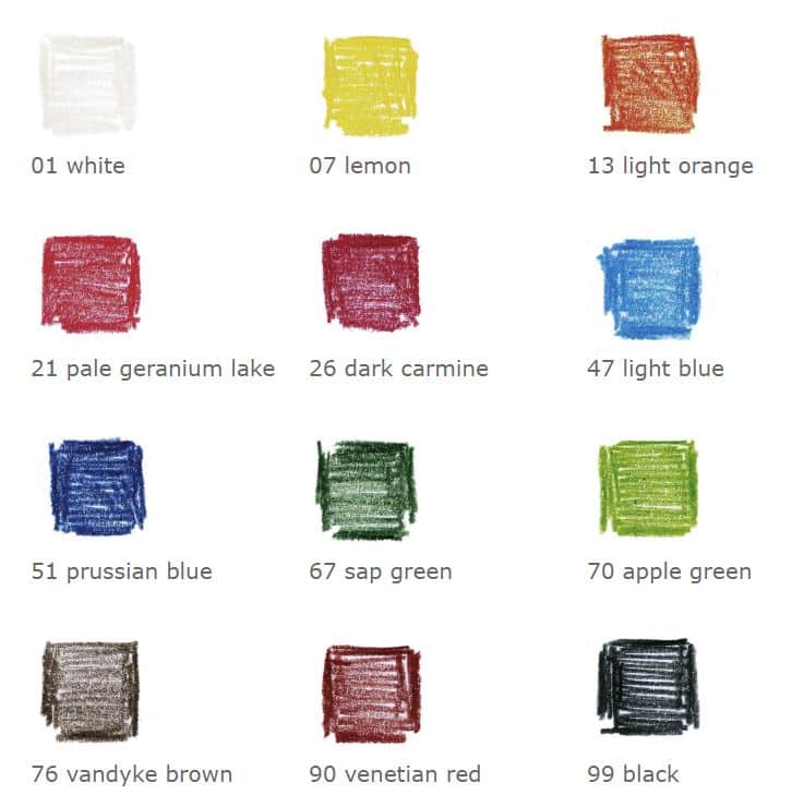 12 assorted colors. color: 01 white | 07 lemon | 13 light orange | 21 pale geranium lake | 26 dark carmine | 47 light blue | 51 Prussian blue | 67 sap green | 70 apple green | 76 Van Dyke brown | 90 venetian red | 99 black