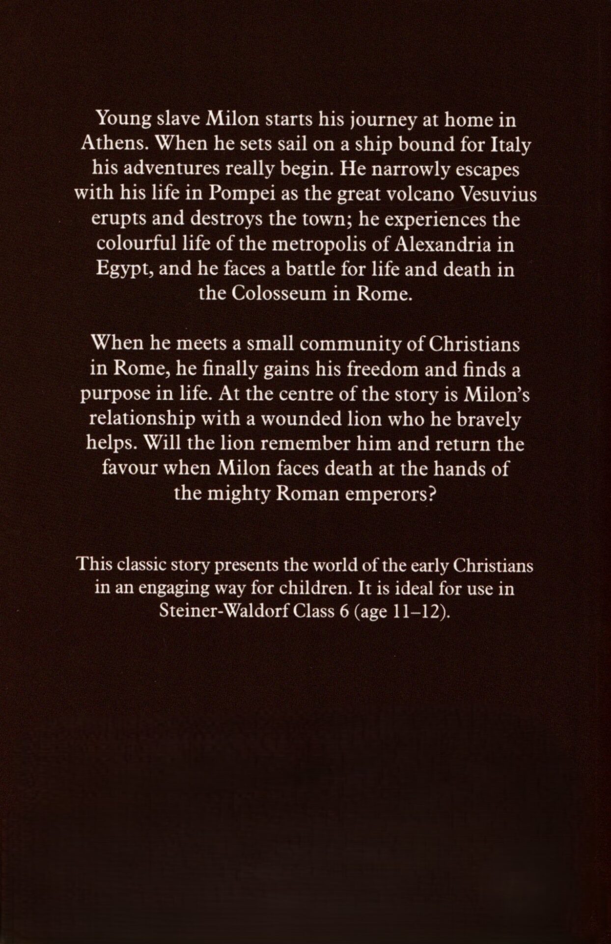 When he meets a small community of Christians in Rome, he finally gains his freedom and finds a purpose in life. At the center of the story is Milon’s relationship with a wounded lion who he bravely helps. Will the lion remember him and return the favor when Milon faces death at the hands of the mighty Roman emperors?