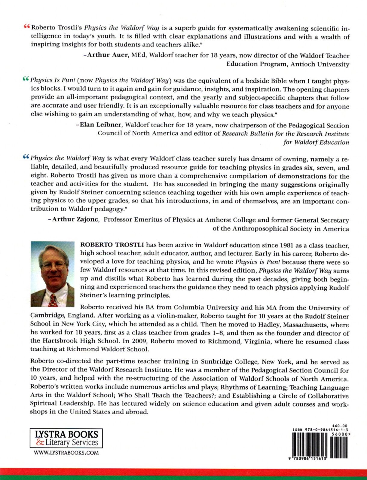 Roberto Trostli has been active in Waldorf education since 1981 as a class teacher, high school teacher, adult educator, author, and lecturer. He received his BA from Columbia University and his MA from the University of Cambridge, England. After working as a violinmaker, Roberto taught for ten years at the Rudolf Steiner School in New York City, the school he also attended as a child. Later, he moved to Hadley, Massachusetts, where he worked for eighteen years, first as a class teacher of graded 1 to 8, and then as the founder and director of the Hartsbrook High School. In 2009, Roberto moved to Richmond, Virginia, where he resumed class teaching at Richmond Waldorf School. Roberto also worked as a pedagogical consultant and lectured and offered workshops internationally. He was co-director of the part-time teacher training in Sunbridge College in New York, and served as Director of the Waldorf Research Institute. Roberto was a member of the Pedagogical Section Council for ten years and helped restructure the Association of Waldorf Schools of North America (AWSNA). Roberto’s written works include numerous articles and plays. In addition to this volume, he edited Teaching Language Arts in the Waldorf School (2004) and Creating a Circle of Collaborative Spiritual Leadership (2014), and has written a book about the college of teachers in Waldorf schools. Early in his career, Roberto became interested in teaching science and wrote Physics is Fun!—revised and reissued as Physics the Waldorf Way (2016).