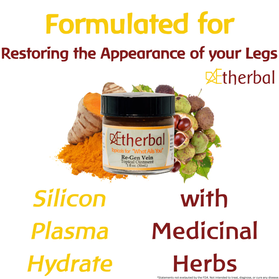 One of Ætherbal’s most refined creations, Re Gen Vein is a patent-pending topical designed to support the appearance of healthy-looking skin in areas affected by visible veins. This specialty formula brings together Orthosilicic Acid with carefully selected herbal extracts and essential oils, chosen for their long histories of traditional use and complementary properties.