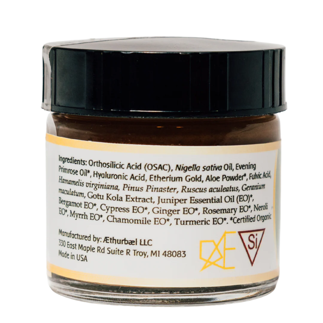 Orthosilicic Acid (OSAC), Nigella sativa Oil, Evening Primrose Oil*, Hyaluronic Acid, Etherium Gold, Aloe Powder*, Fulvic Acid, Hamamelis virginiana*(organic alcohol), Pinus Pinaster, Ruscus aculeatus*(organic alcohol), Geranium maculatum*(organic alcohol), Gotu Kola Extract, Juniper Essential Oil (EO)*, Bergamot EO*, Cypress EO*, Ginger EO*, Rosemary EO*, Neroli EO*, Myrrh EO*, Chamomile EO*, Turmeric EO*, Choline Citrate, Potassium Sorbate (naturally derived from cassava).