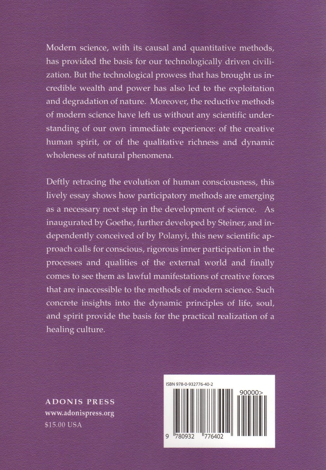 Retracing the evolution of human consciousness, this lively book shows how participatory methods are emerging as the necessary next step in the development of science. As inaugurated by Goethe, further developed by Steiner, and independently conceived of by Polanyi, this new scientific approach calls for conscious participation in the processes and qualities of the world. It sees them as manifestations of creative forces that elude the methods of materialistic science. Insights into the dynamic principles of life and spirit provide the basis for a healing culture.
