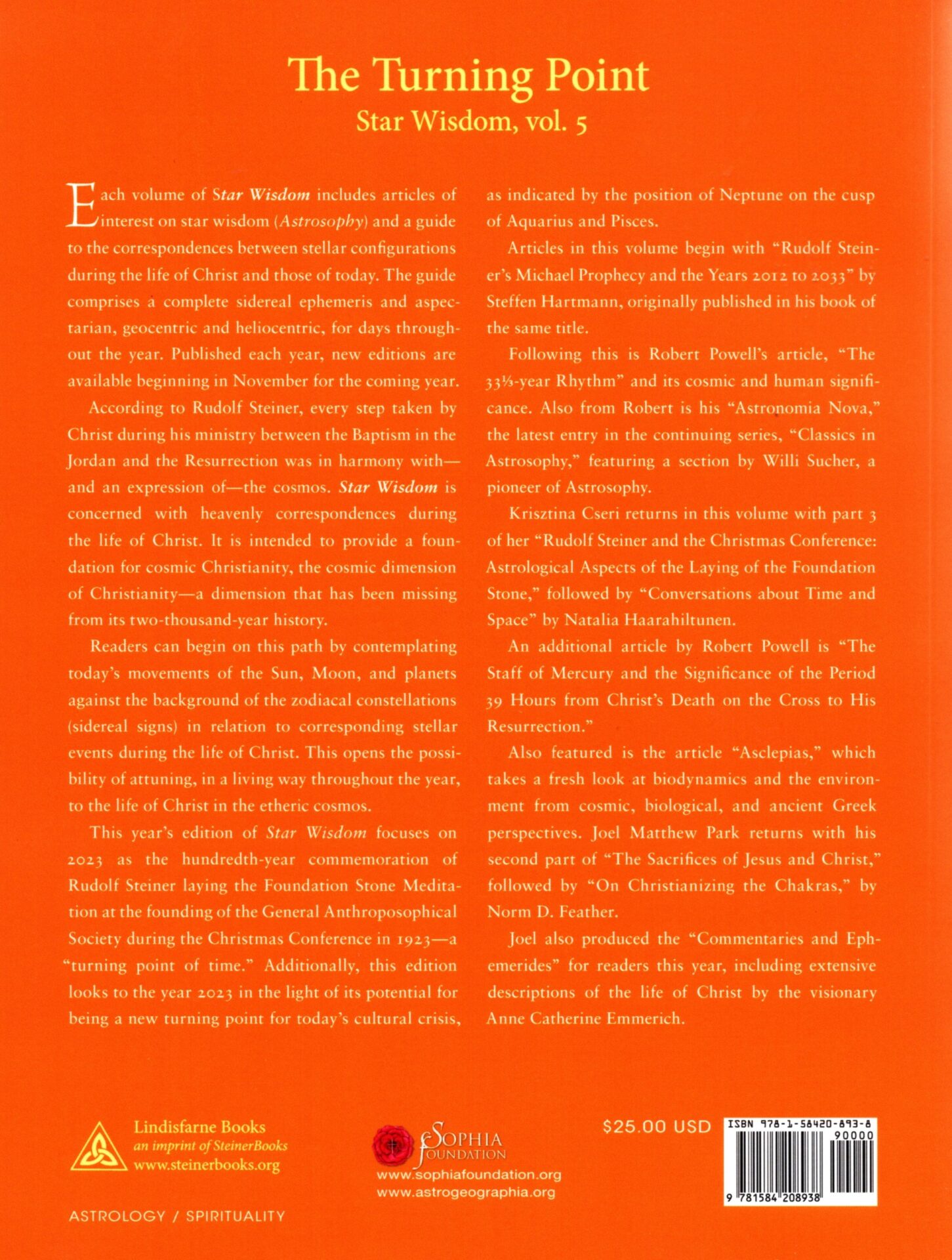 Star Wisdom, volume 5, includes articles of interest concerning star wisdom (Astrosophy), as well as a guide to the correspondences between stellar configurations during the life of Christ and those of today. This guide comprises a complete sidereal ephemeris and aspectarian, geocentric and heliocentric, for each day throughout the year. Published yearly, new editions are available beginning in October or November for the coming year.